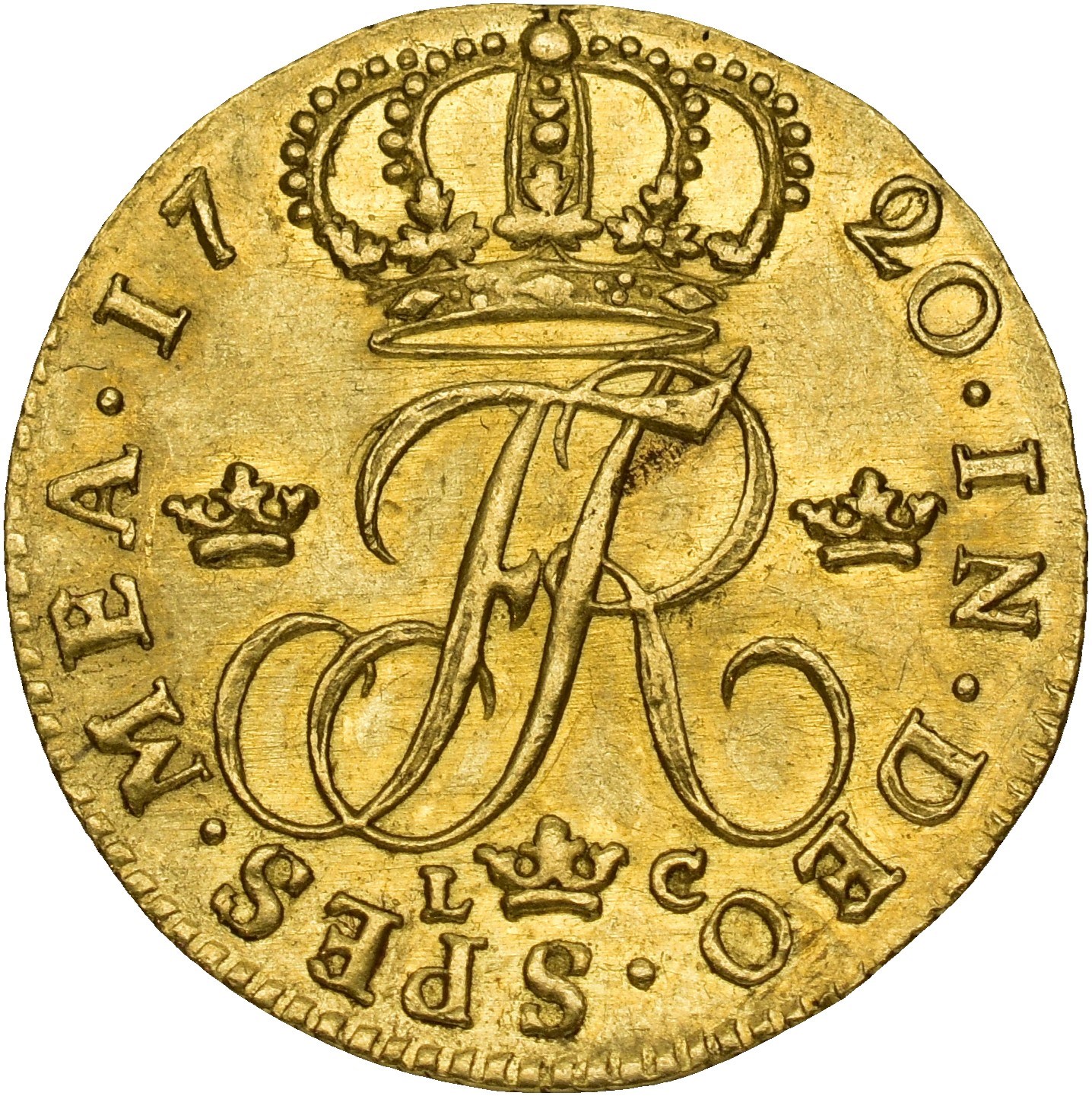 Dukat 1720, Stockholm. 3,48 g. Myntmester L-C Lorentz Careelberg. Variant med hårkrøll under ermet. Sjelden Rare.