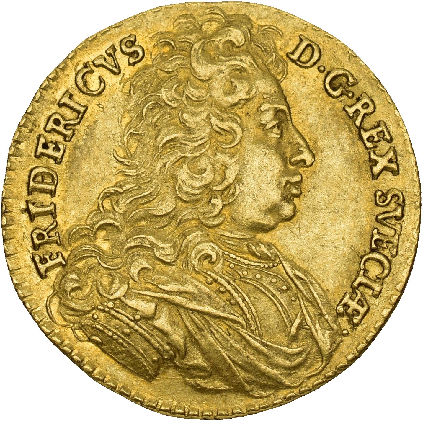Dukat 1720, Stockholm. 3,48 g. Myntmester L-C Lorentz Careelberg. Variant med hårkrøll under ermet. Sjelden Rare.