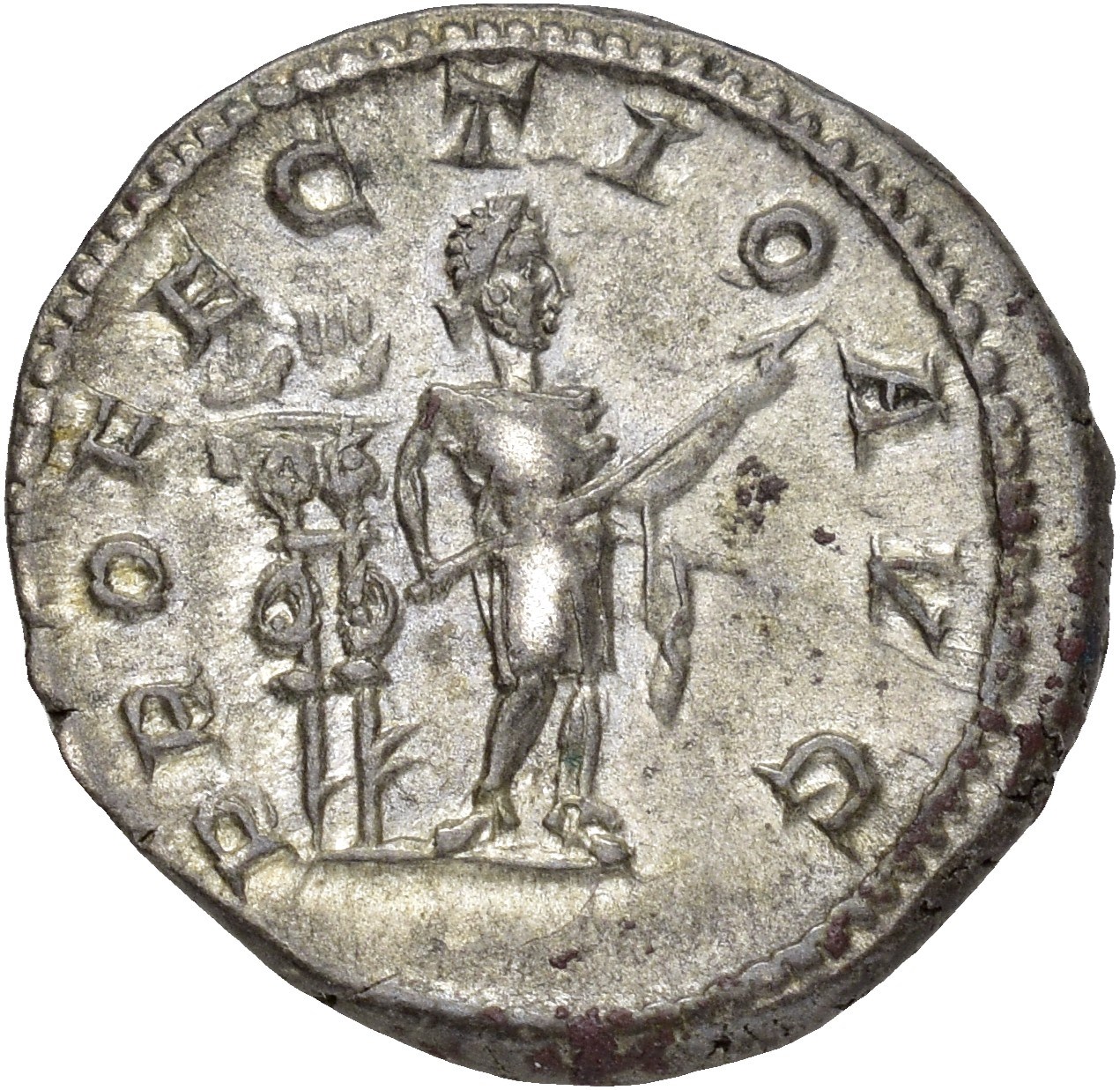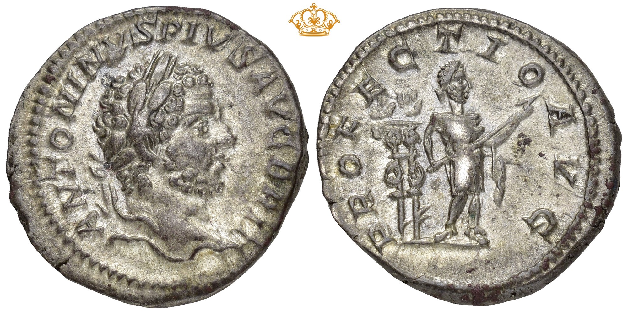 Caracalla, AD 198-217. AR Denarius (19 mm; 3.26 g). Rome mint, struck AD 210-213. Laureate head right / Emperor standing right in military attire, holding transverse spear with both hands, behind him, two signa. Deeply toned.