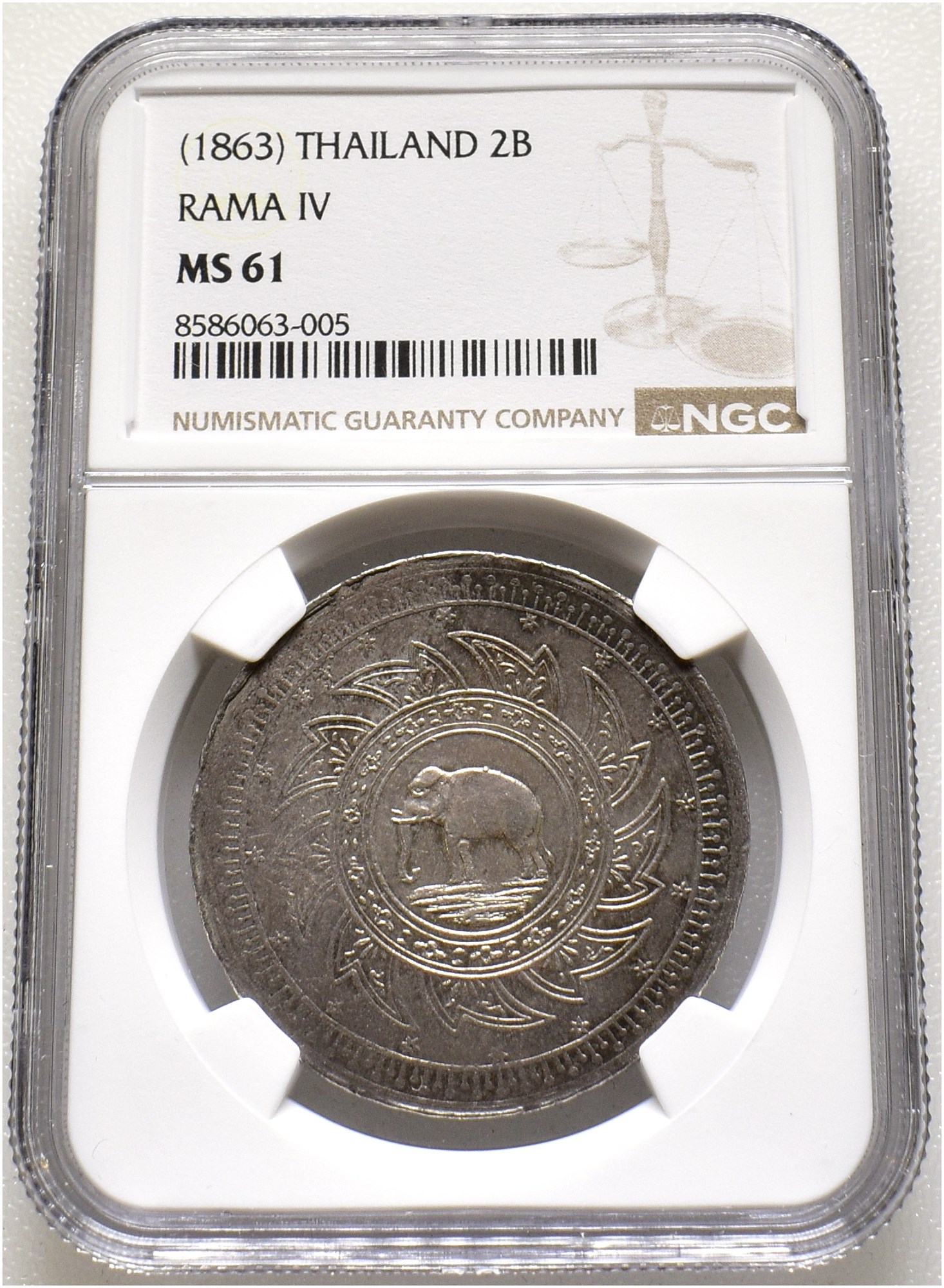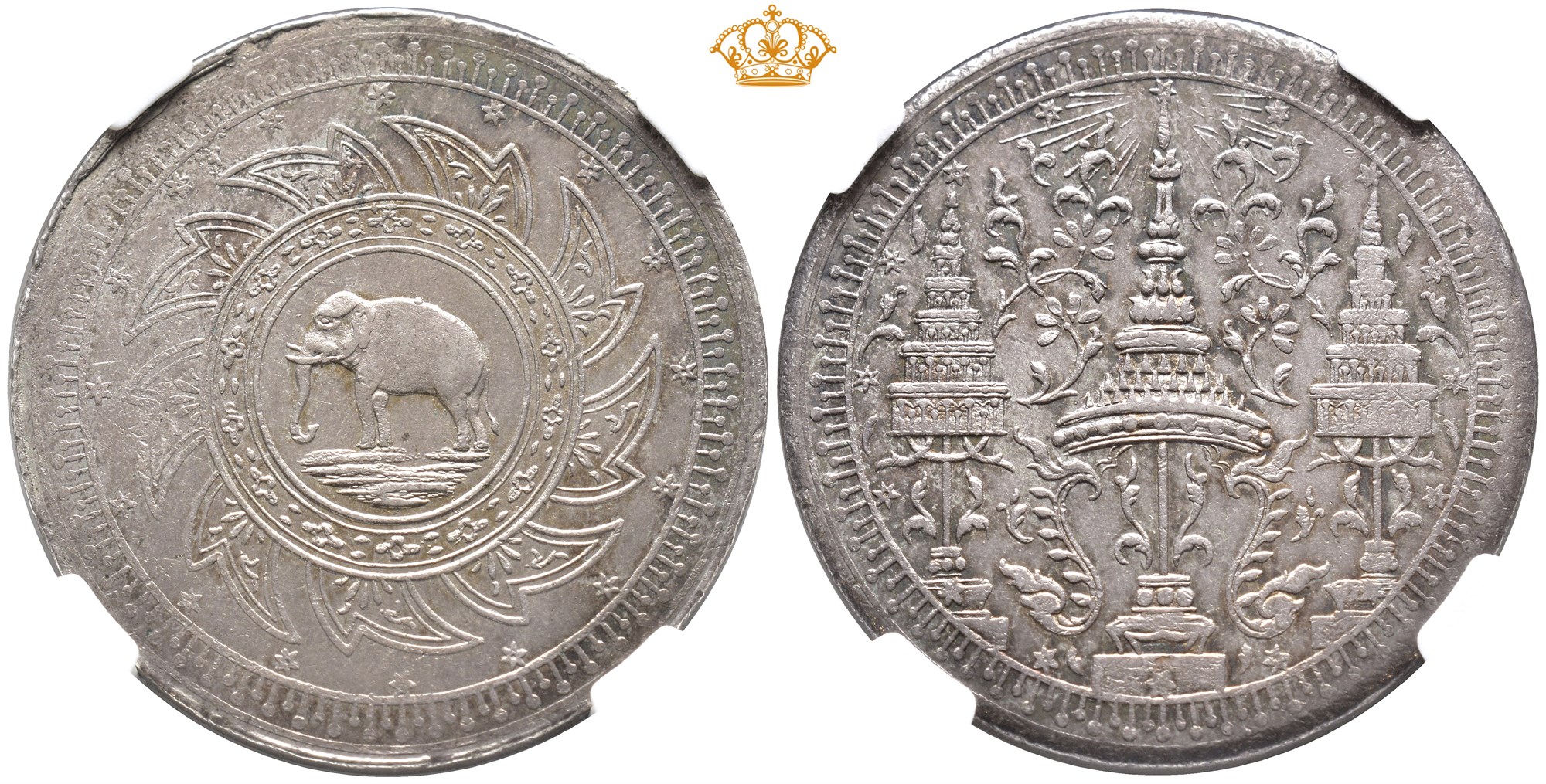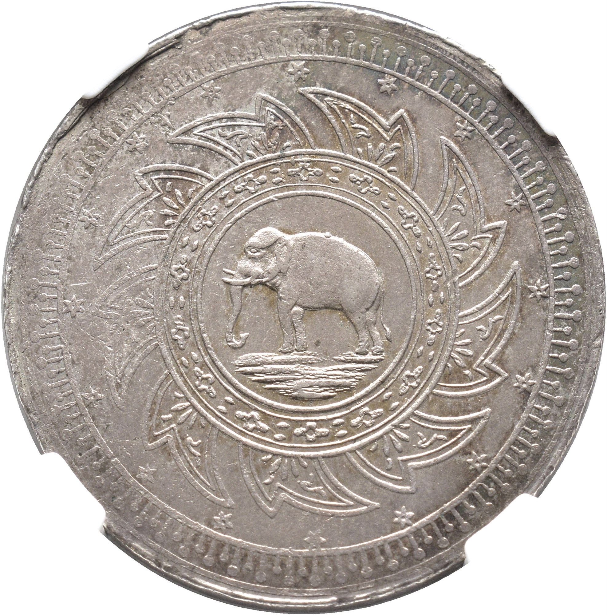 2 Bath - 1/2 Tamlung ND (1863). 30,2 g. Elephant left within a chakra; around, sixteen stars denoting the value. Religious inspired motif / design.