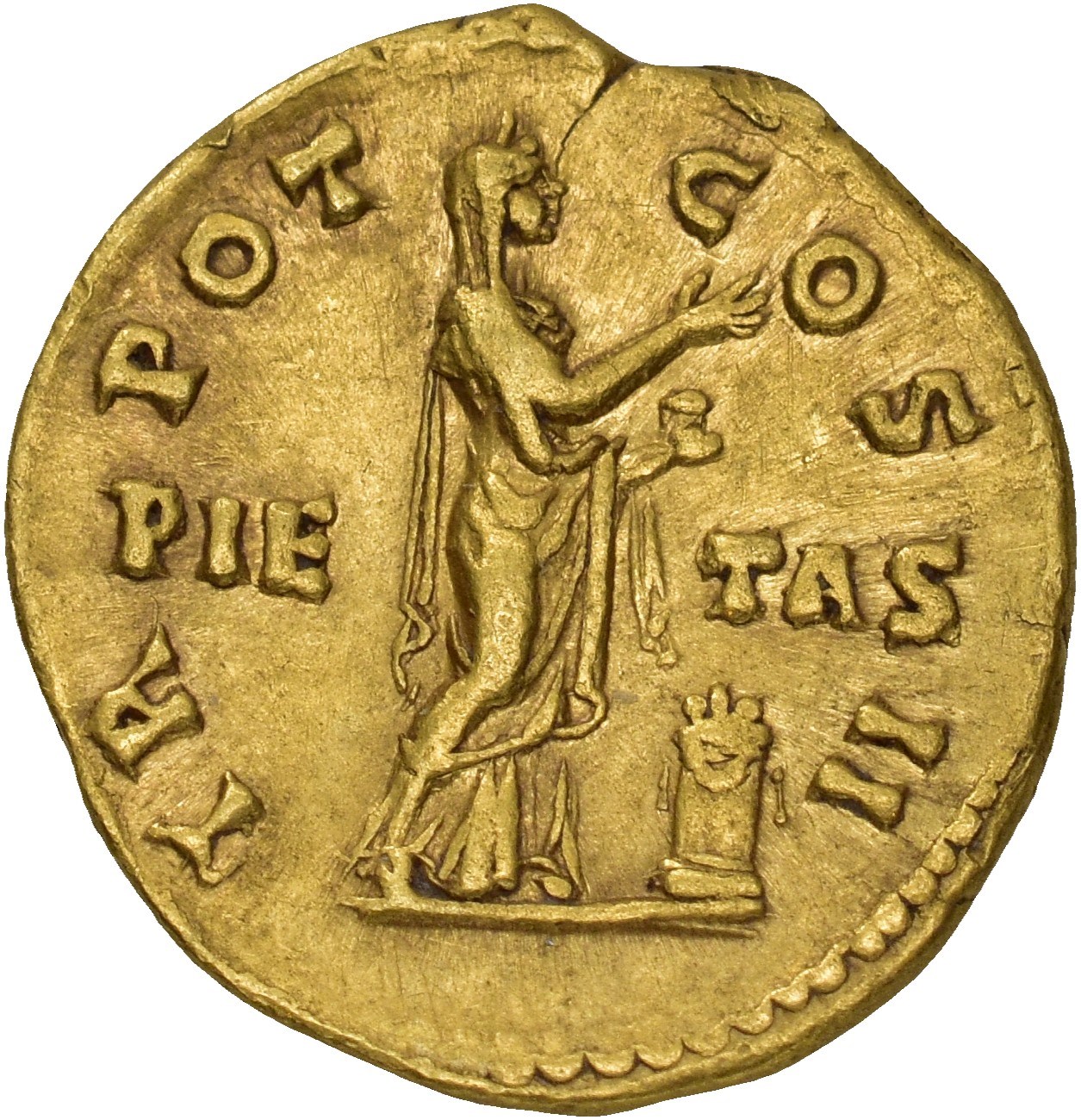Aelius, as Caesar, AD 136-138. AV Aureus (20 mm; 7.10 g). Rome mint, struck under Hadrian, AD 137. Bare-headed and draped bust right / Pietas standing right, holding acerrum in left hand and sprinkling incense with right hand over lit and garlanded altar. A few edge scuffs and edge marks, otherwise, a clear and attractive specimen with a portrait of fine style. Light gold toning. Rare.