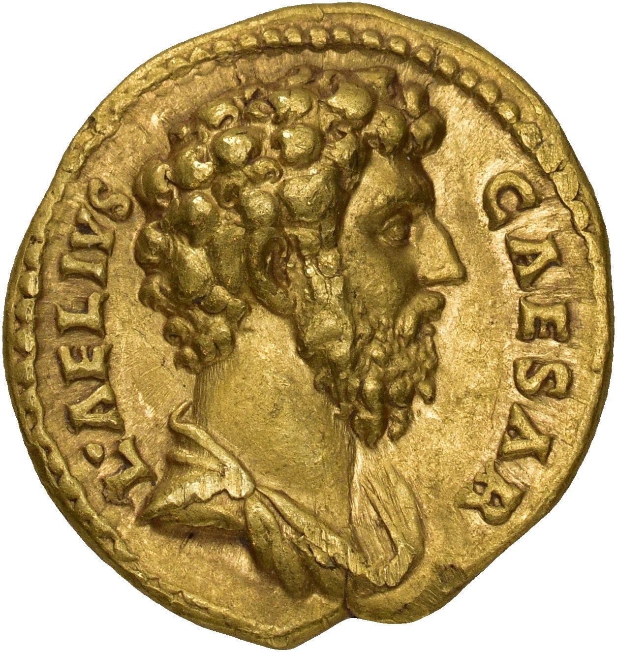 Aelius, as Caesar, AD 136-138. AV Aureus (20 mm; 7.10 g). Rome mint, struck under Hadrian, AD 137. Bare-headed and draped bust right / Pietas standing right, holding acerrum in left hand and sprinkling incense with right hand over lit and garlanded altar. A few edge scuffs and edge marks, otherwise, a clear and attractive specimen with a portrait of fine style. Light gold toning. Rare.