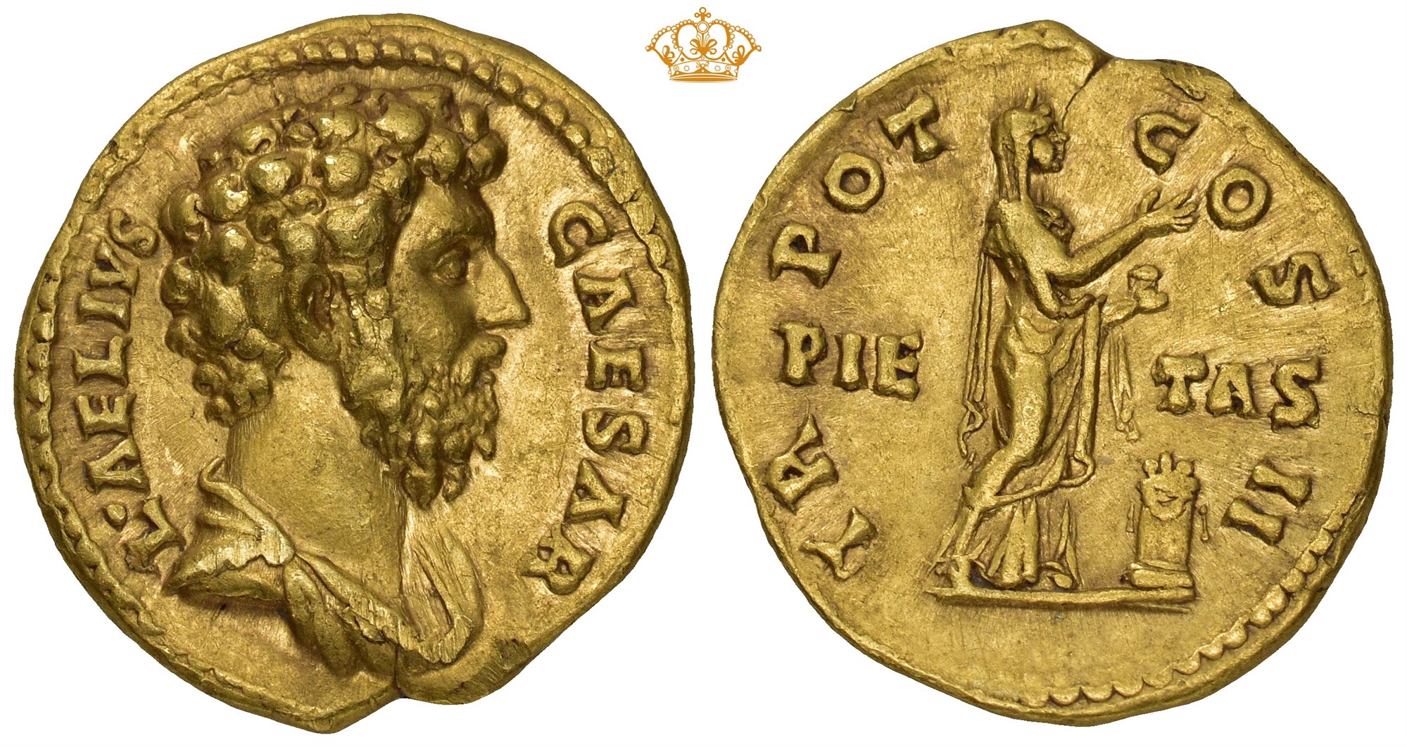Aelius, as Caesar, AD 136-138. AV Aureus (20 mm; 7.10 g). Rome mint, struck under Hadrian, AD 137. Bare-headed and draped bust right / Pietas standing right, holding acerrum in left hand and sprinkling incense with right hand over lit and garlanded altar. A few edge scuffs and edge marks, otherwise, a clear and attractive specimen with a portrait of fine style. Light gold toning. Rare.