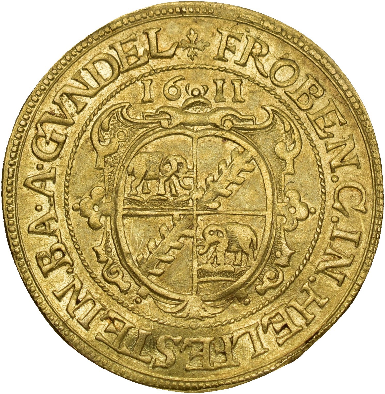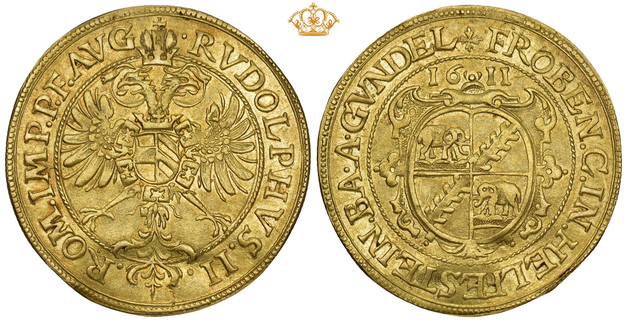 Gulden 1611. 3,21 g. Obv.: Oval arms bearing two elephants, legend: "FROBEN. C. IN. HELFENSTEIN. BA.A. GVNDEL"; Rev.: Imperial eagle, titles of Holy Roman Emperor Rudolf II.<BR>Just two gold coins are known to have been struck by Helfenstein, and this type is reportedly represented by only three specimens; the present example was formerly part of the celebrated Kroisos Collection, renowned for its assemblage of gold rarities of the highest quality and importance.<BR>Minimal traces of filing at the edge.
