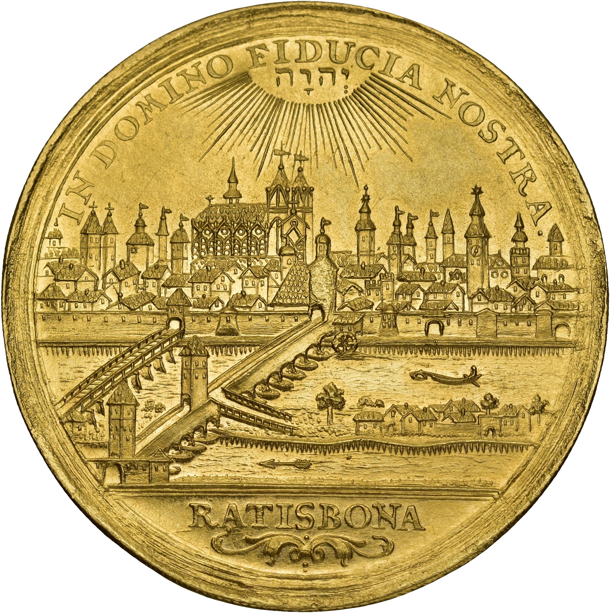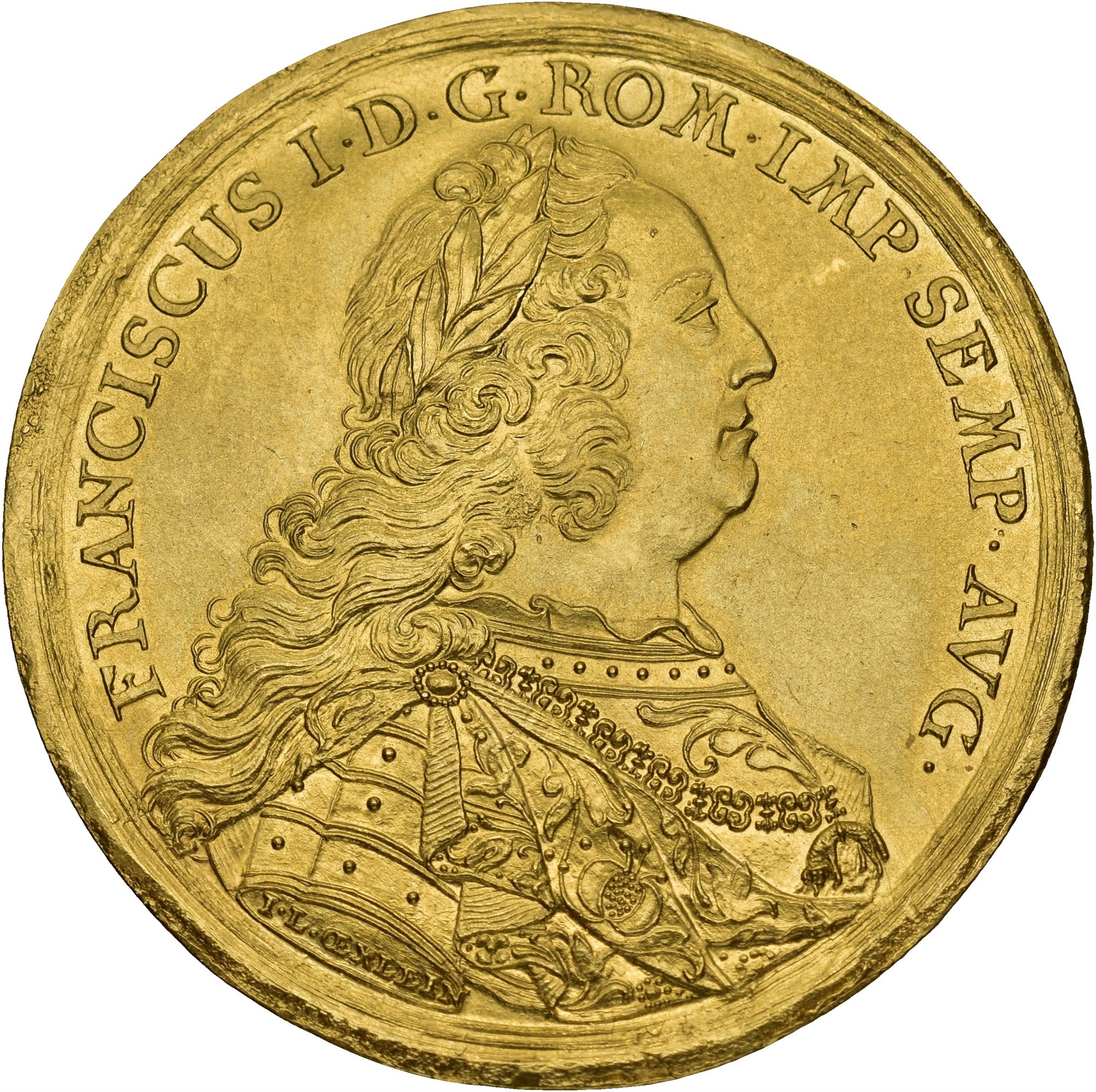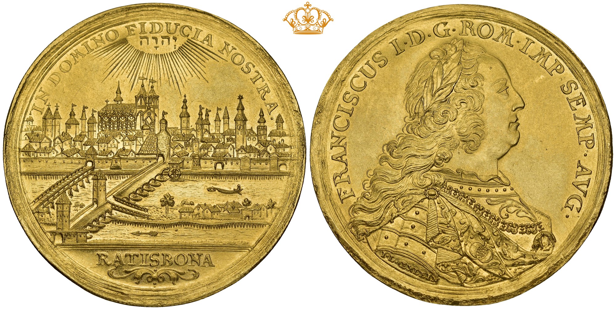 4 Ducats ND (1745-1765), Regensburg. 13,94 g. Mintmaster Johann Leonhard Oexlein.The radiant name of God above a city view; on the reverse, armoured bust of the Emperor right, laureate and draped, signed I. L. OEXLEIN on the truncation. A splendid city-view multiple ducat, preserved in outstanding quality. The panorama highlights St Peter’s Cathedral and the Stone Bridge across the Danube, key architectural symbols of Regensburg’s prominence as an Imperial city and seat of the Reichstag.