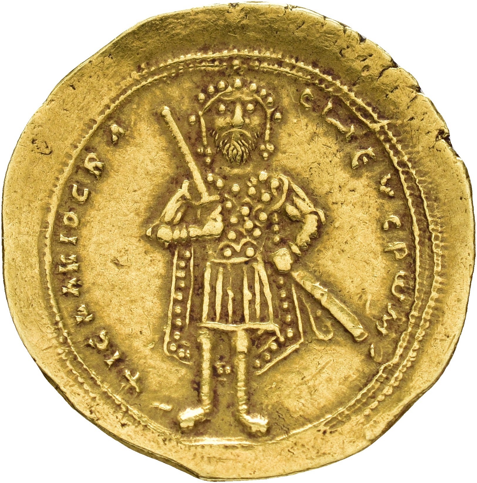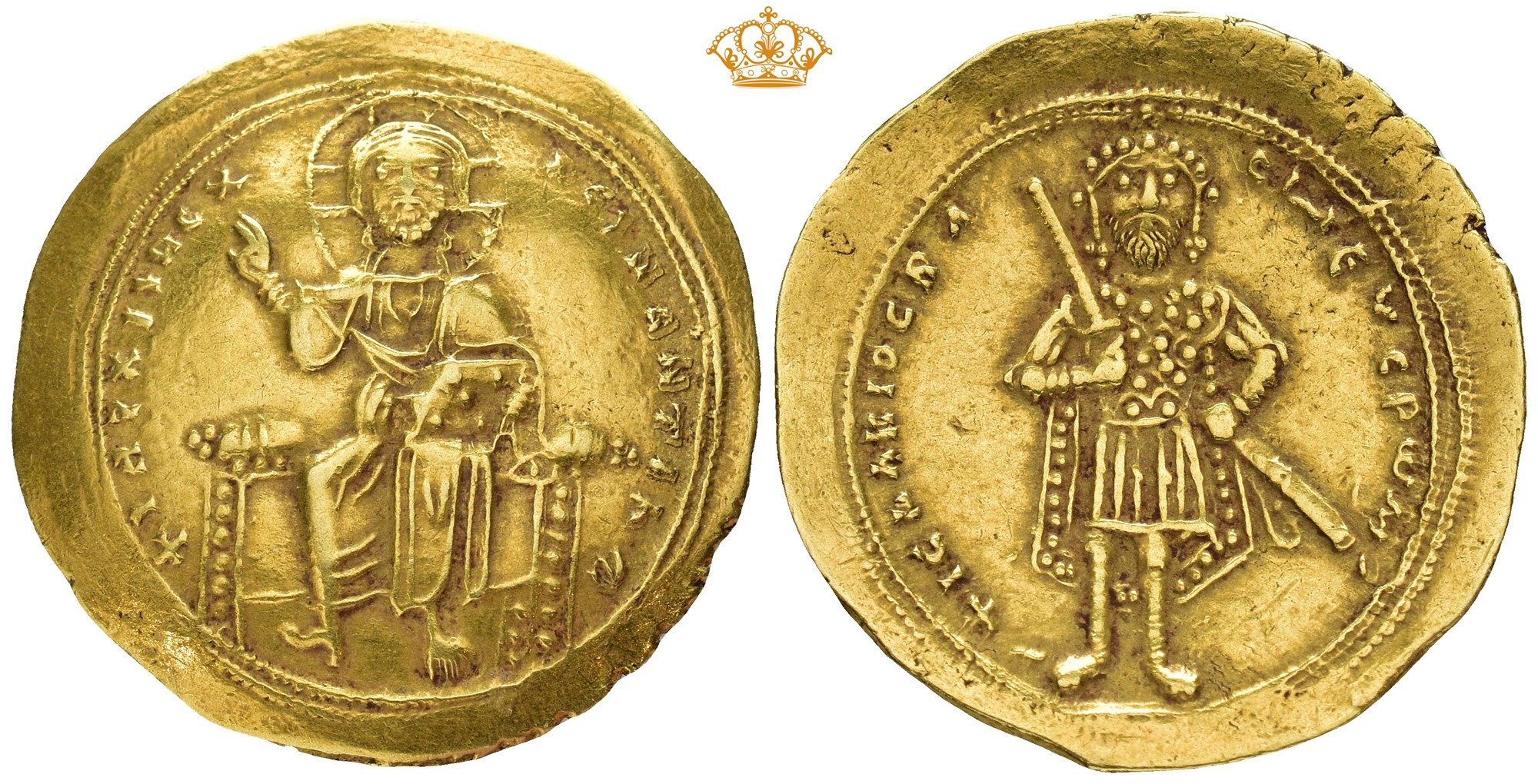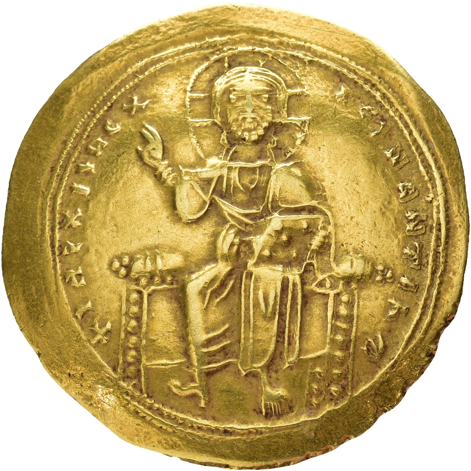 Isaac I Komnenos. 1057-1059. AV Histamenon Nomisma (24 mm; 4.42 g). Constantinople mint. Christ Pantokrator enthroned facing, raising right hand in benediction, and holding Gospels / Isaac standing facing, wearing loros, holding sword with right hand and hilt with left. Lightly brushed and almost invisible hairline on reverse. Light gold toning.