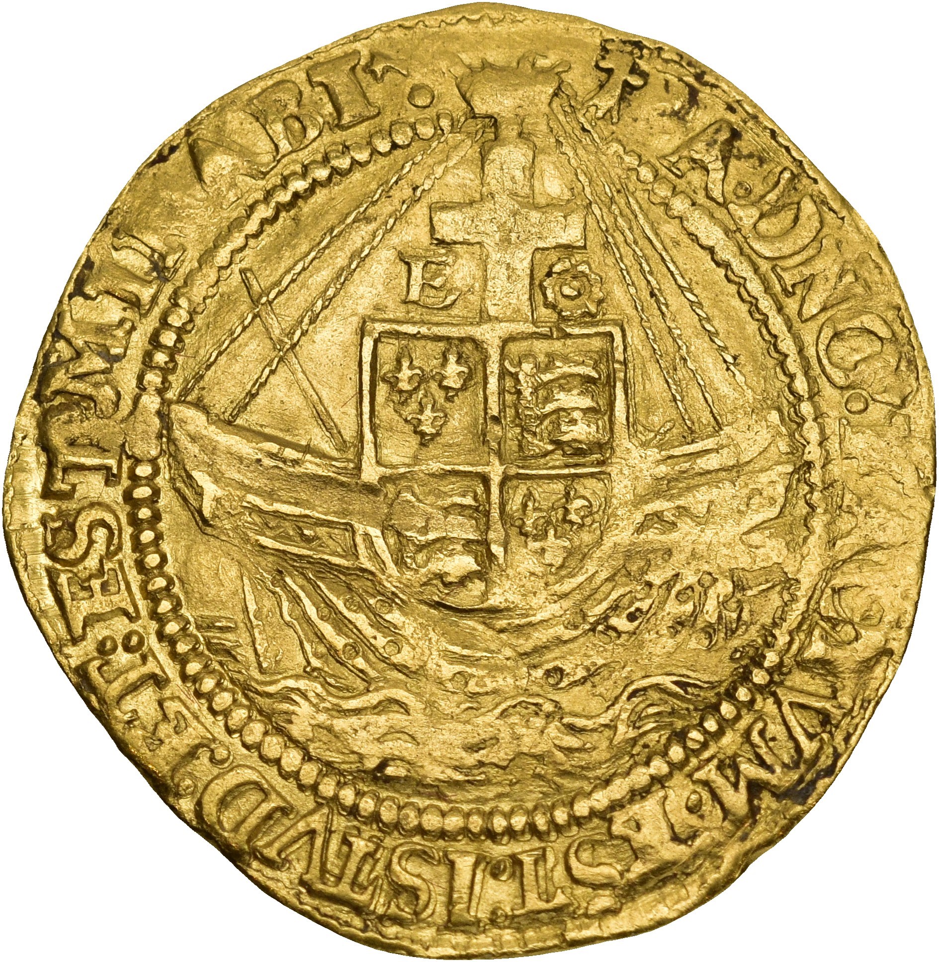 Rev.: A: DNO: FACTVM: EST: ISTVD: ET: EST: MIRABI. Quartered shield of France and England on a ship; cross on mast, flanked by E and a rose.
