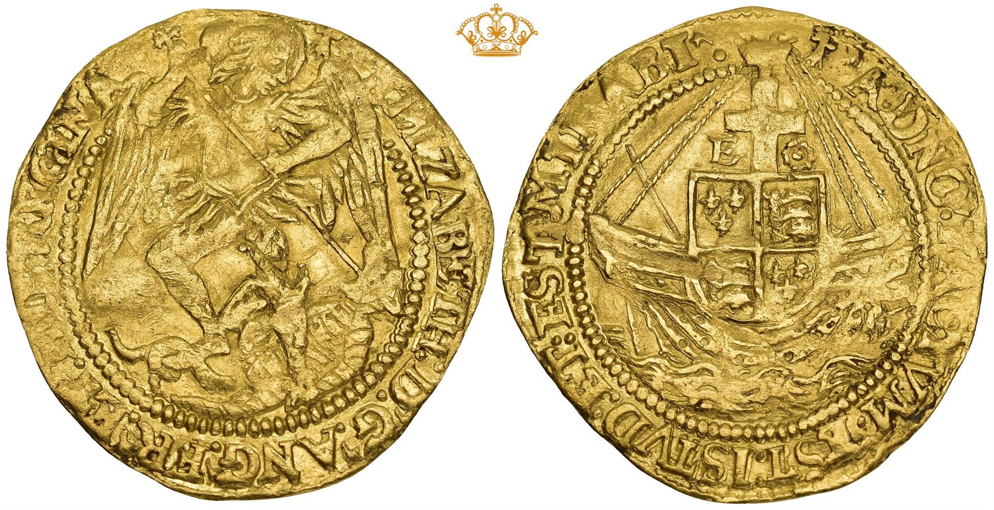Obv.: ELIZABETH: D: G: ANG: FR: ET: HIB: REGINA. St Michael standing right, piercing the dragon with his lance.